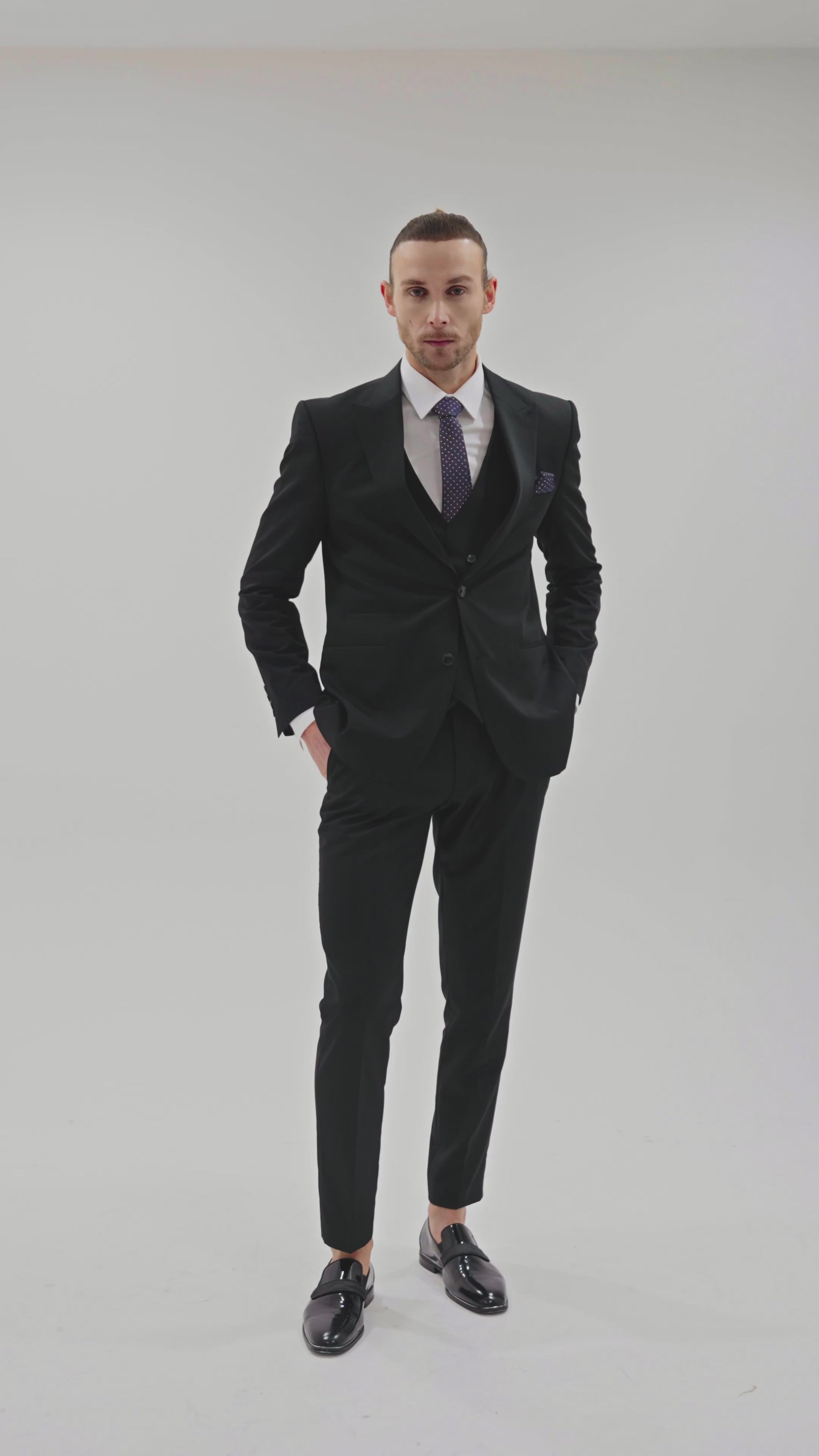 Upgrade your formal wardrobe with our sophisticated Black Classic Two-Button Slim Fit Suit from Envy Suits. Crafted from high-quality fabric designed for comfort and longevity, this luxury men's suit showcases a timeless two-button closure, refined peak lapel, and elegant besom pockets. Complemented by a matching double-breasted waistcoat, this versatile suit effortlessly blends classic style with modern sophistication, making it perfect for weddings, business meetings, and formal occasions.