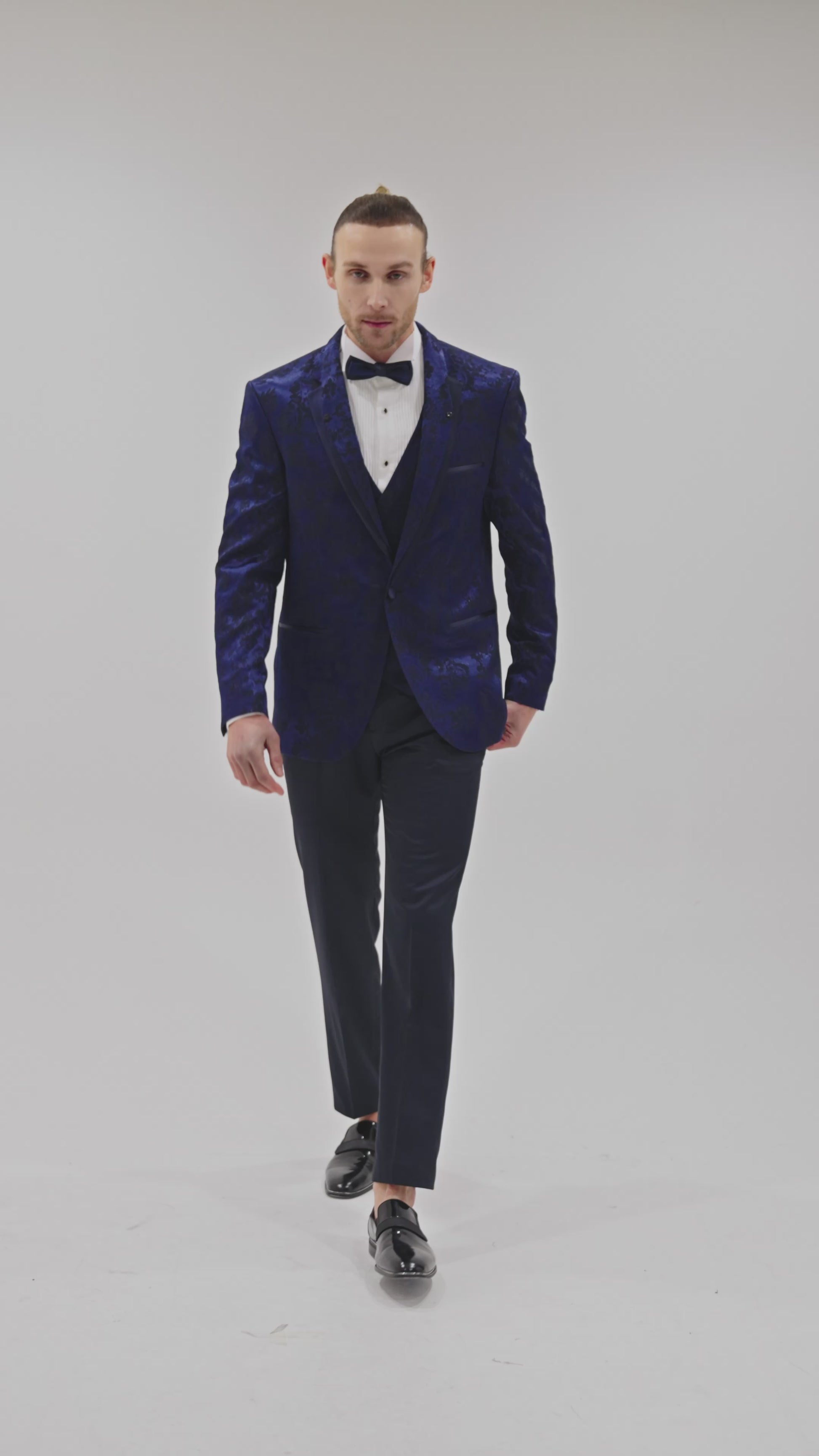 Stand out in sophistication with our Navy Jacquard Double Lapel Tuxedo Suit from Envy Suits. Crafted from unique jacquard fabric featuring an elegant embossed floral pattern, this luxury men's suit provides unmatched texture and refined style. Its striking double-layer peak lapel, adorned with rich navy satin, is designed for versatility, allowing you to remove the floral lapel detail as desired. Complete with a matching waistcoat and stylish shiny trousers, this unique tuxedo delivers the ultimate wow factor for weddings, celebrations, and formal occasions.